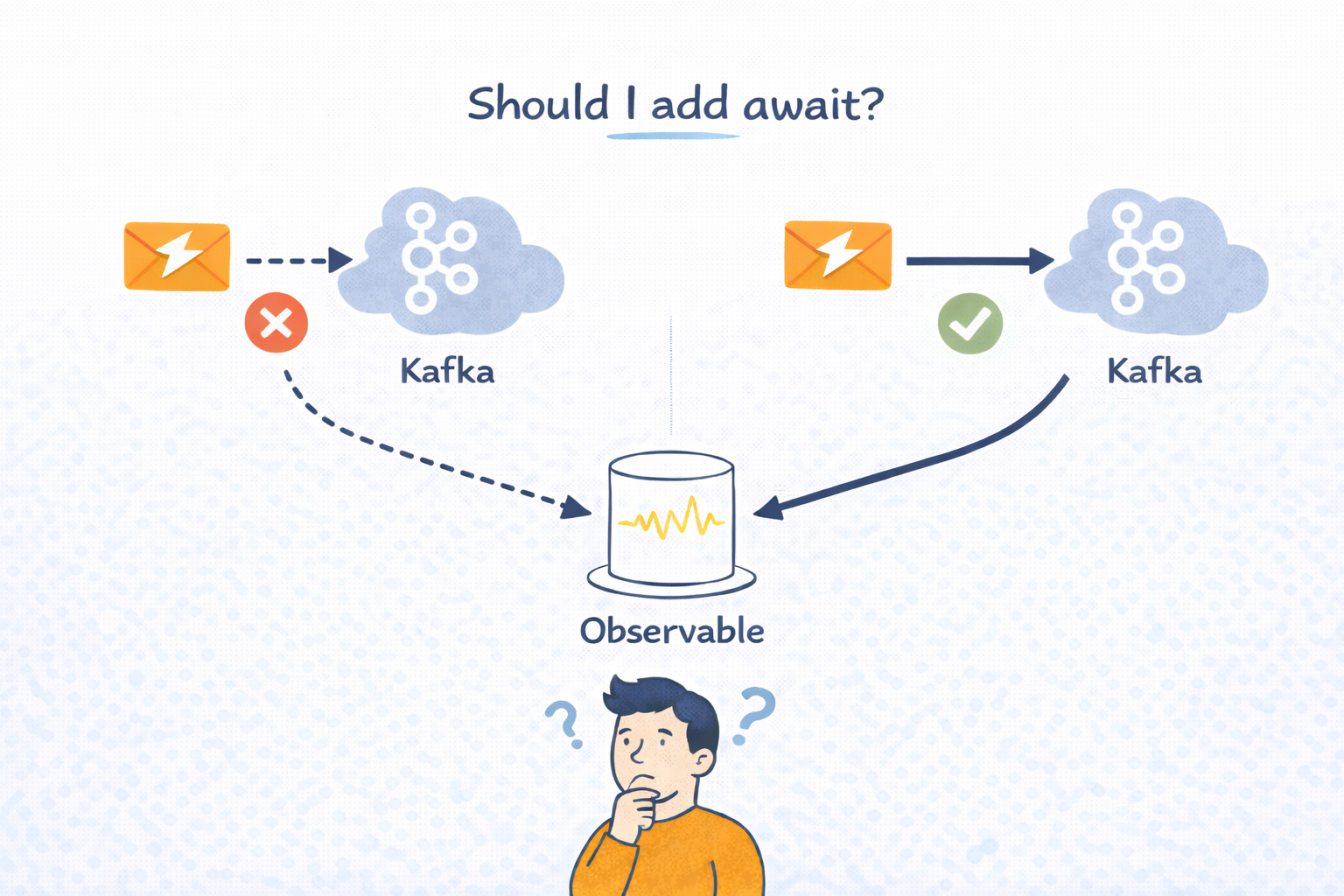this.client.emit(topic, payload);위와 같이 emit()을 단순히 호출만 한 경우, 이 코드는 “이벤트 발행을 시도했다” 의미에 가깝다. 전송 과정에서 오류가 발생하더라도 그 실패는 Observable 내부에서 처리되며 호출한 쪽에서는 이를 인지하지 못할 수 있다.